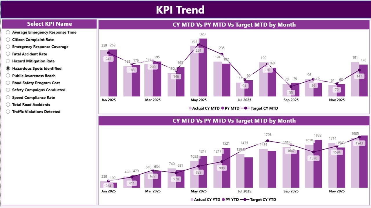 The dashboard provides Month-to-Date (MTD) and Year-to-Date (YTD) performance tracking along with Target vs Actual comparisons and Previous Year benchmarking. Therefore, organizations gain a comprehensive understanding of road safety performance.