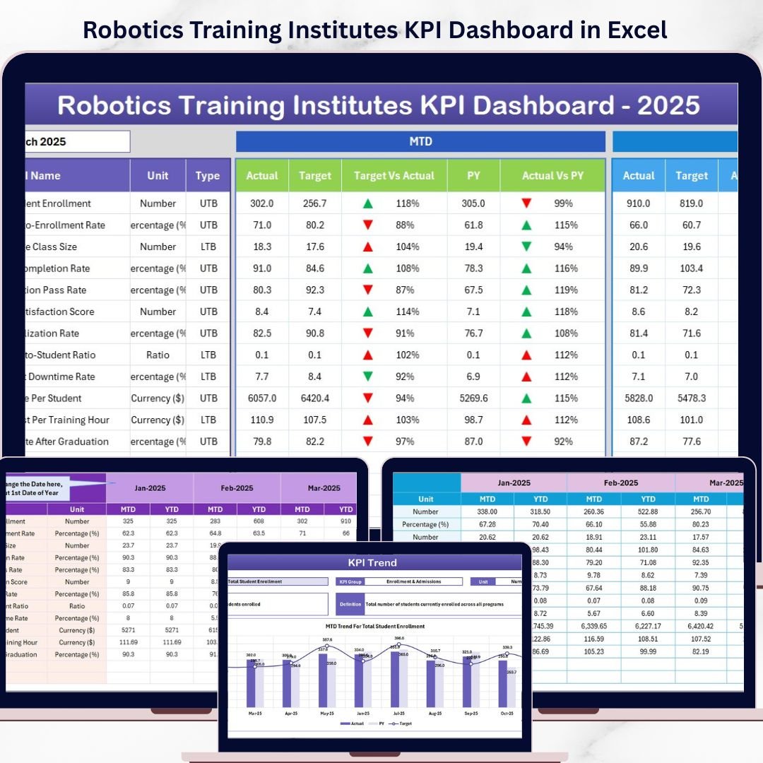 This digital product is a ready-to-use Excel-based KPI dashboard tailored specifically for robotics training institutes. It includes: