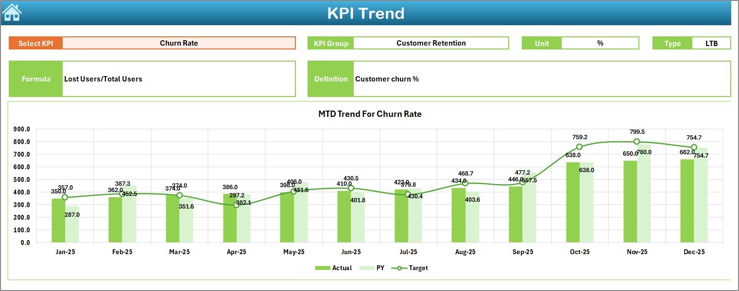 6️⃣ For detailed trend analysis, choose a KPI from Cell C3 in the Trend sheet.