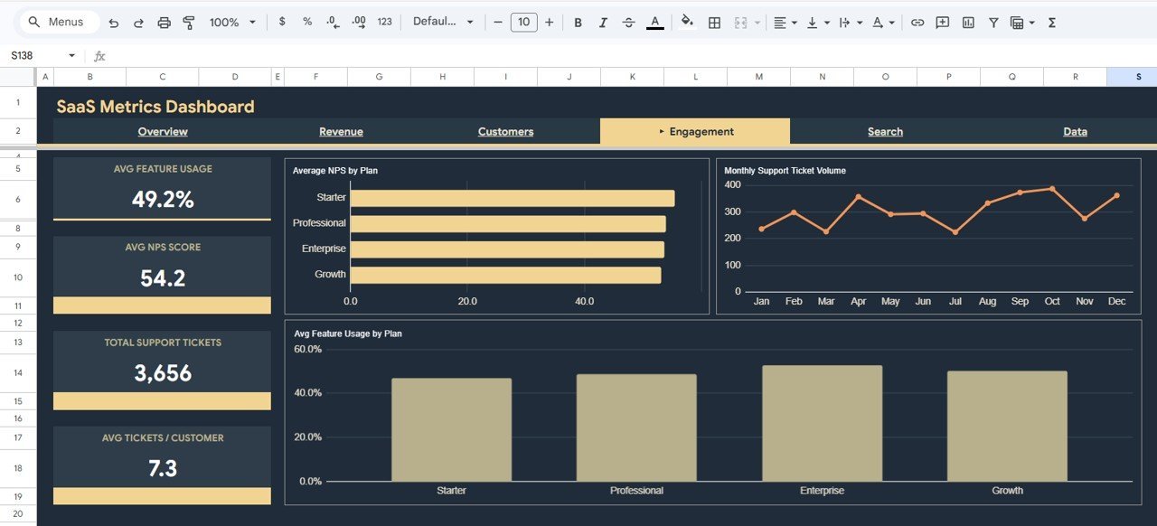 The SaaS Metrics Dashboard in Google Sheets from NextGenTemplates is one of the best options available. It includes 6 dedicated pages covering Overview, Revenue Analysis, Customers Analysis, Engagement Analysis, Search, and Data entry — all with interactive charts and slicers for comprehensive SaaS business tracking.