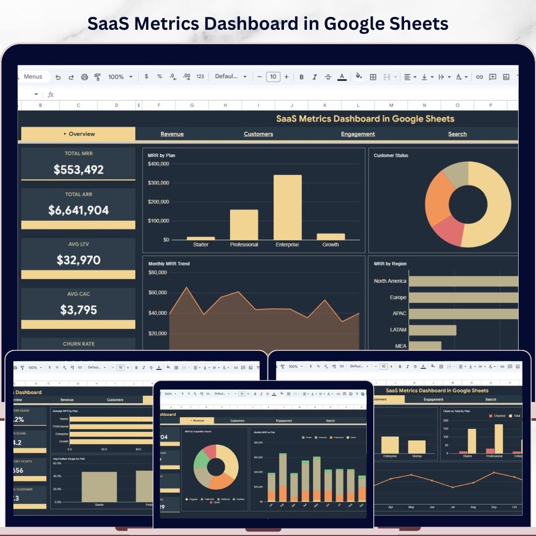 SaaS Metrics Dashboard in Google Sheets is a professionally designed, interactive analytics template built for SaaS founders, product managers, subscription business analysts, and growth teams who need to monitor Monthly Recurring Revenue (MRR), Annual Recurring Revenue (ARR), Customer Lifetime Value (LTV), Customer Acquisition Cost (CAC), and Churn Rate — all from one powerful Google Sheets dashboard that works on any device. This template includes 6 interactive sheet tabs covering Overview, Revenue Analysis, Customers Analysis, Engagement Analysis, Search, and Data, making it one of the most comprehensive Google Sheets Dashboard Templates available for SaaS businesses.