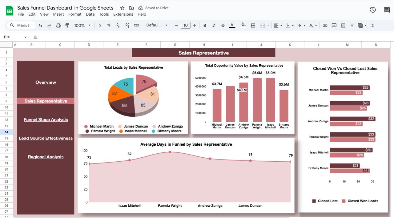 Charts: Total Leads by Rep, Opportunity Value by Rep, Closed Won vs Lost by Rep, Avg. Days in Funnel by Rep