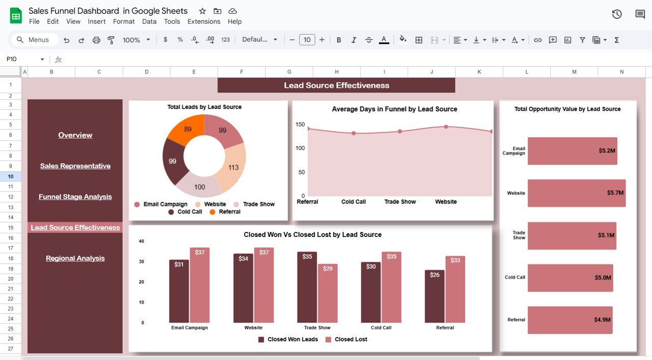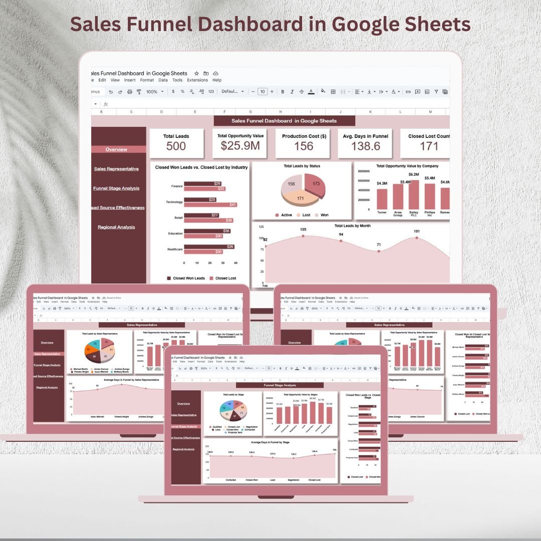 Whether you’re a startup founder, sales manager, or part of a large sales team, this dashboard helps you track leads, monitor conversions, evaluate team performance, and forecast revenue with ease. Because it’s built in Google Sheets, the dashboard is collaborative, customizable, and accessible from anywhere.Sales Funnel Dashboard in Google Sheets