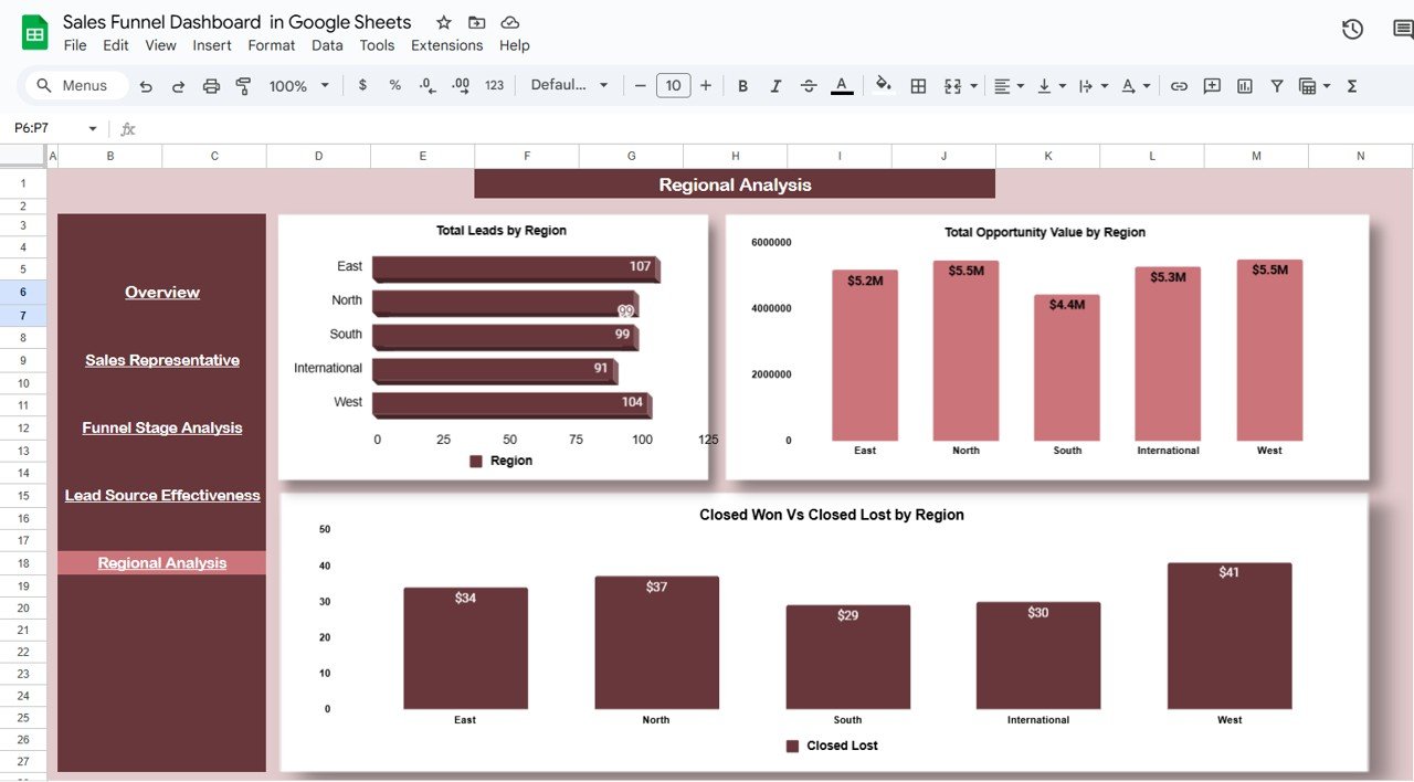 Charts: Leads by Region, Opportunity Value by Region, Closed Won vs Lost by Region