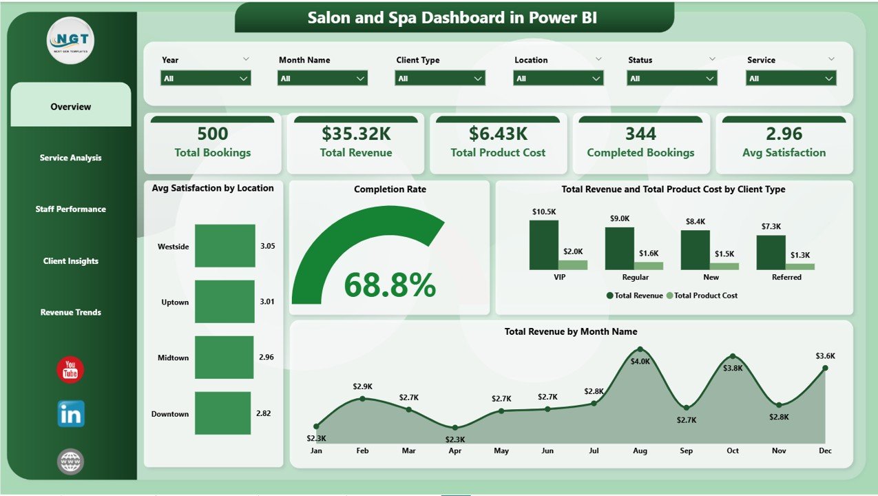 1 – Overview Page: This is your high-level command center. At the top, you’ll find KPI cards showing Total Bookings, Total Revenue, Total Product Cost, Completed Bookings, and Avg Satisfaction. Below, interactive charts display Avg Satisfaction by Location, Completion Rate, Total Revenue and Total Product Cost by Client Type, and Total Revenue by Month Name. Dynamic slicers let you filter the entire view instantly.
