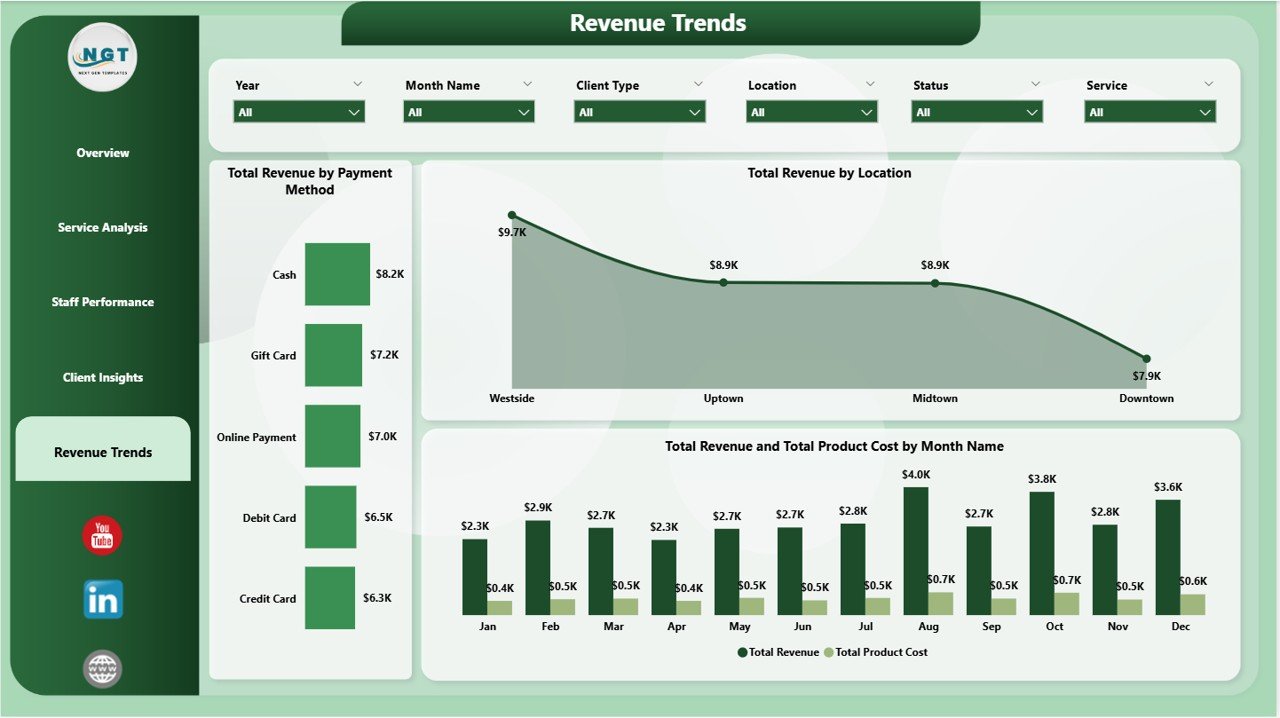 Salon and Spa Dashboard in Power BI - Revenue TrendsRevenue Trends