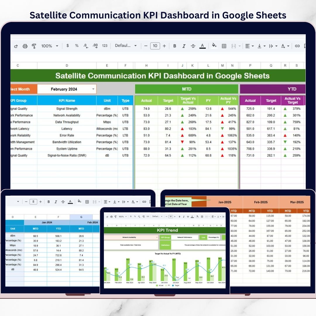 The Satellite Communication KPI Dashboard in Google Sheets is a ready-to-use, interactive performance monitoring tool designed specifically for satellite operations and communication networks. Instead of working with scattered reports and manual spreadsheets, teams use one centralized Google Sheets dashboard to track Month-to-Date (MTD) and Year-to-Date (YTD) KPIs, compare actual performance with targets, analyze previous year results, and identify issues early 📊.