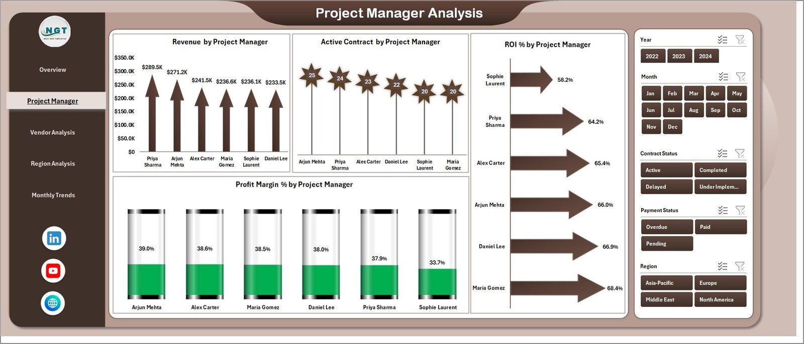 Analyzes performance by project manager with metrics such as revenue generation, ROI, active contracts, and profitability.