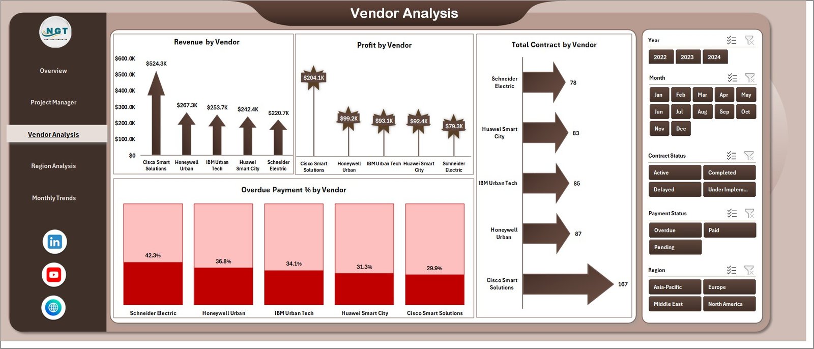 4️⃣ Use the interactive slicers to filter the dashboard by vendor, region, project manager, or month.