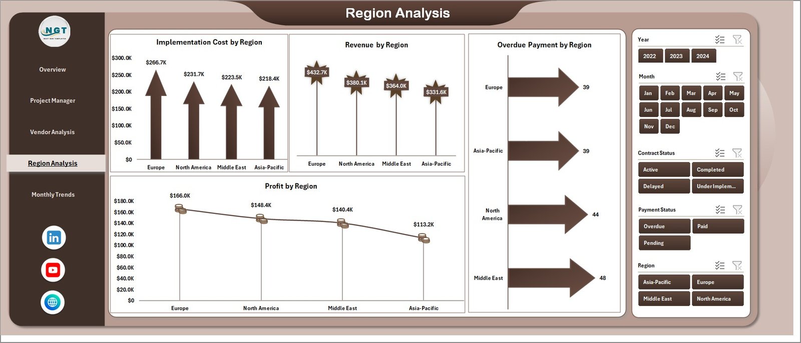Provides insights into how projects perform across regions by analyzing implementation cost, revenue, overdue payments, and profit.