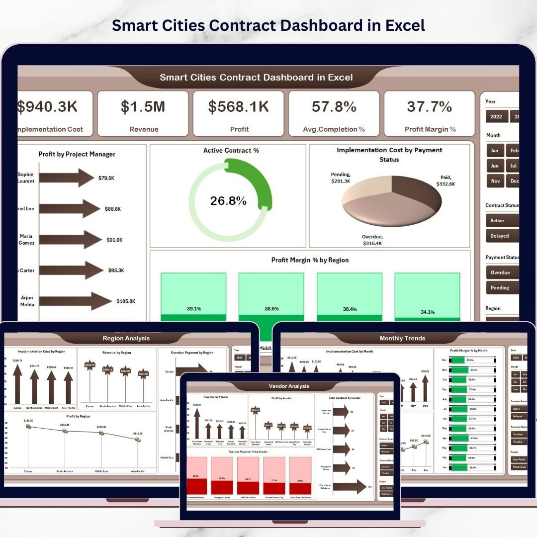 The Smart Cities Contract Dashboard in Excel solves this problem by providing a centralized, interactive analytics solution for monitoring smart city project contracts. This ready-to-use Excel dashboard helps organizations track contract performance, financial outcomes, payment status, and operational efficiency from a single interface.