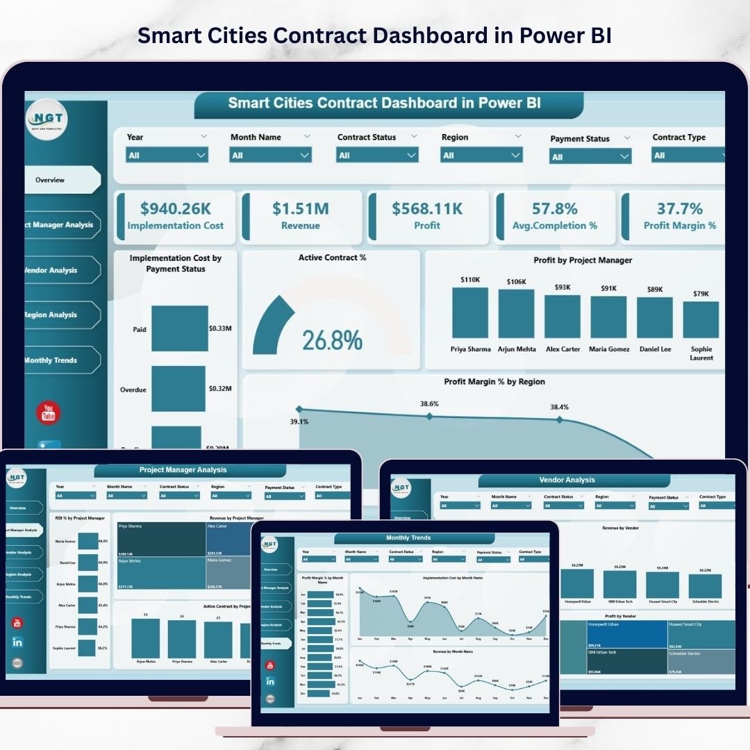 The Smart Cities Contract Dashboard in Power BI is a powerful and interactive analytics tool designed to monitor smart city contract performance, project costs, revenues, profitability, vendor contributions, and operational progress. Instead of analyzing multiple reports, this dashboard centralizes all critical contract metrics into one modern and dynamic Power BI interface.