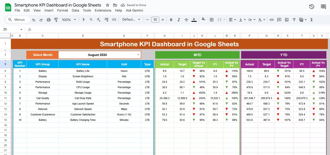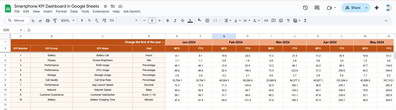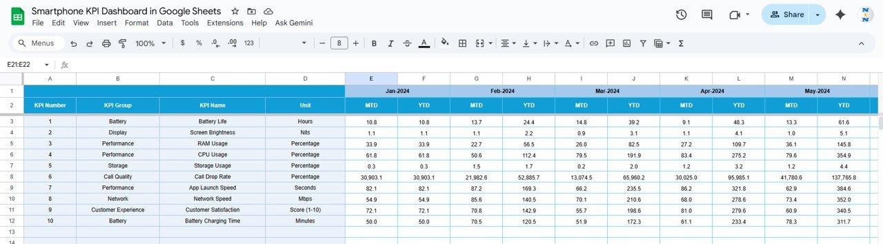 🔑 Key Features of the Smartphone KPI Dashboard in Google Sheets