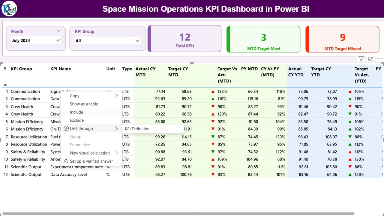 Filter by month, KPI group, or individual KPIs to focus on critical mission aspects.