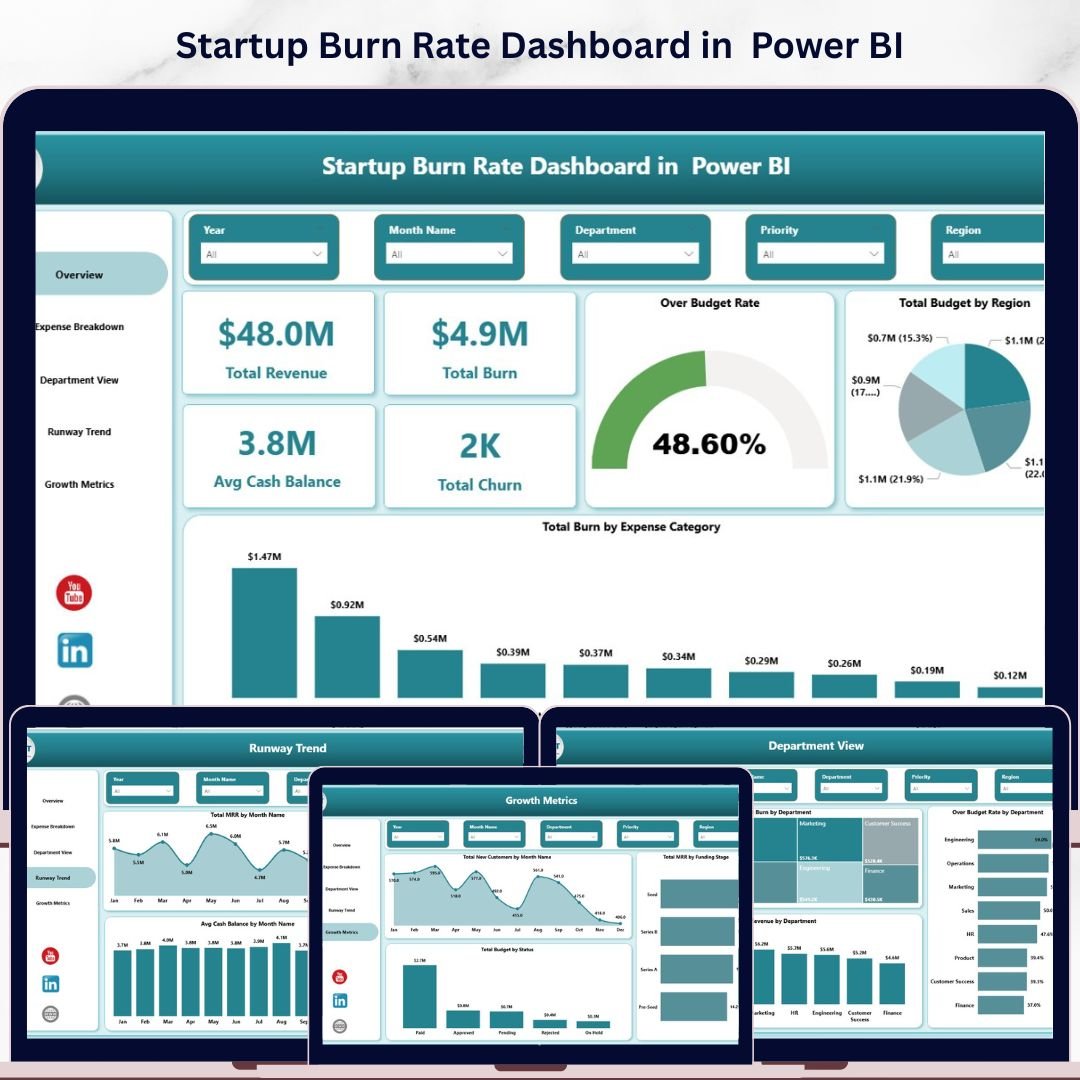 Startup Burn Rate Dashboard in Power BI is a professionally designed, ready-to-use Power BI dashboard template built for startup founders, CFOs, finance teams, and investors who need complete visibility into cash burn, runway trends, revenue growth, and expense breakdowns — all from a single interactive report 📊🔥. This powerful template includes 5 dynamic dashboard pages covering Overview, Expense Breakdown, Department View, Runway Trend, and Growth Metrics, with built-in slicers for instant filtering across every dimension.Startup Burn Rate Dashboard in Power BI