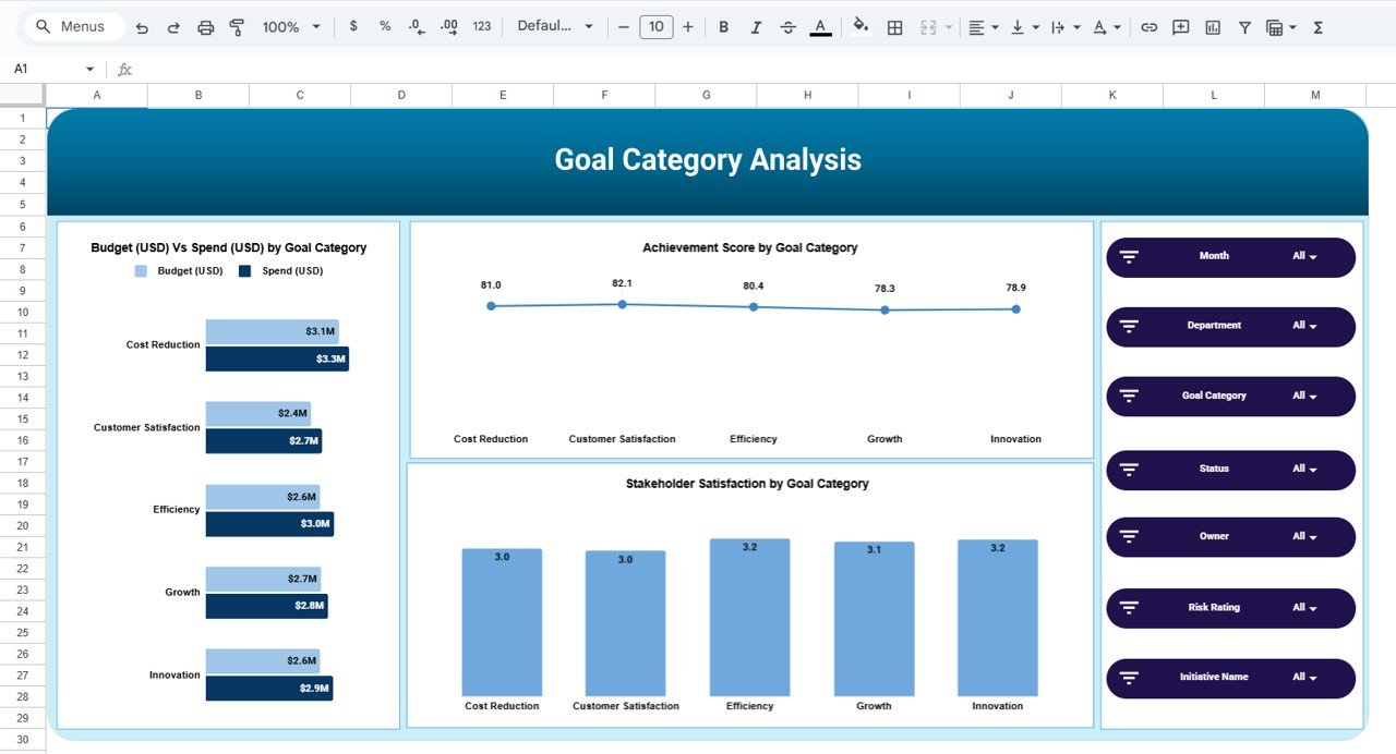 🧩 Interactive Slicers – Filter by Month, Department, Goal Category, Owner, Status, Risk Rating, and Initiative