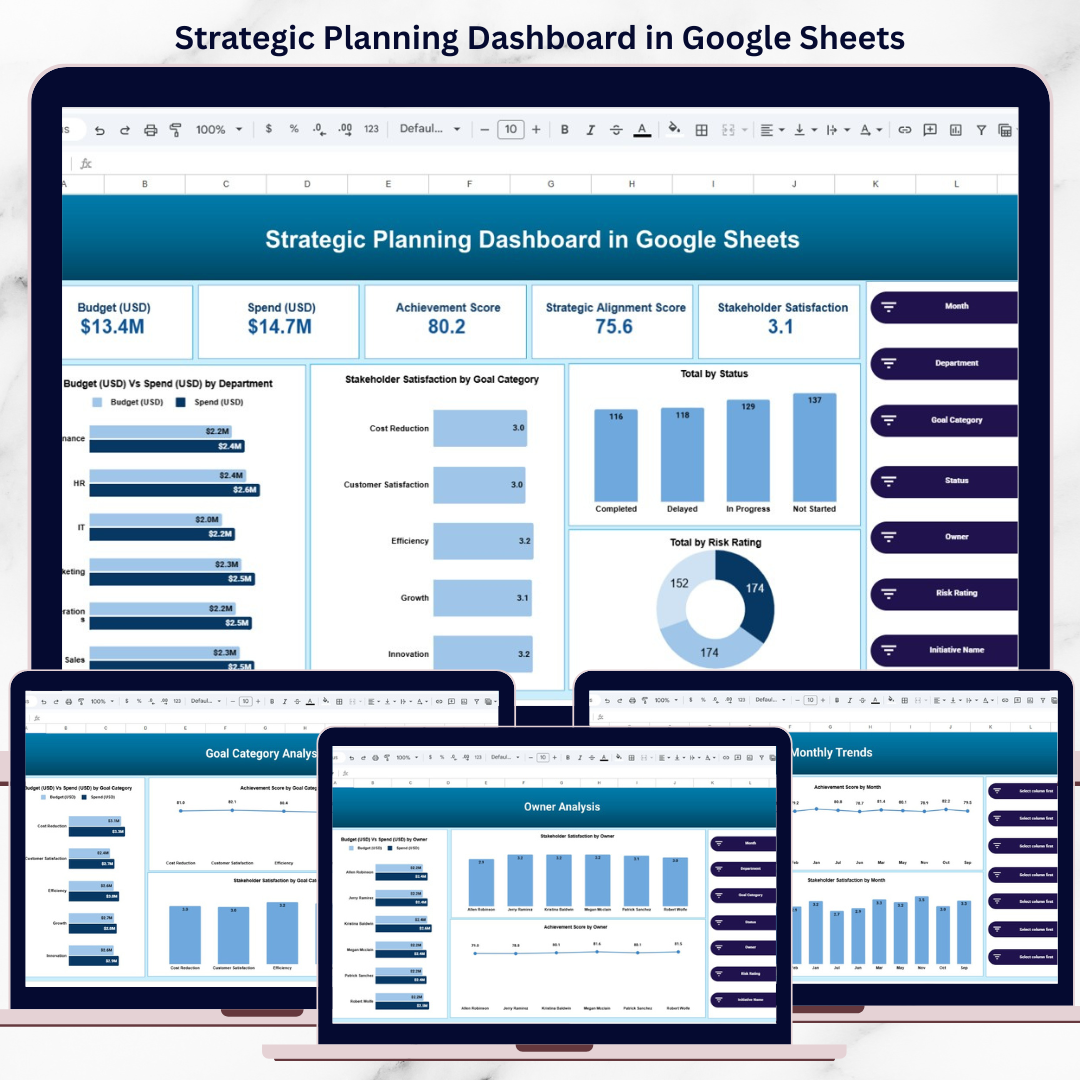 This ready-to-use dashboard converts complex strategic planning data into clear KPIs, interactive visuals, and actionable insights—all inside Google Sheets, without coding or expensive BI tools.