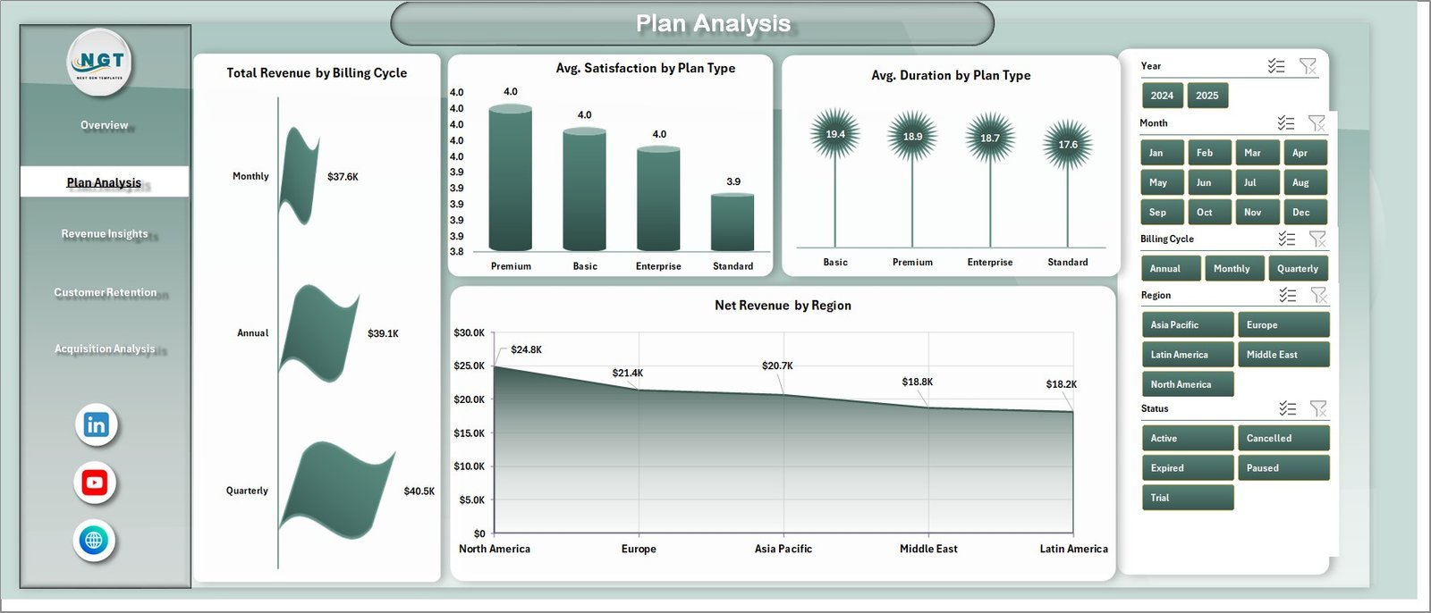 🔹 Plan Analysis Page – Deep dive into subscription plan performance with Total Revenue by Billing Cycle, Avg. Satisfaction by Plan Type, Avg. Duration by Plan Type, and Net Revenue by Region to understand which plans drive the most value and satisfaction.