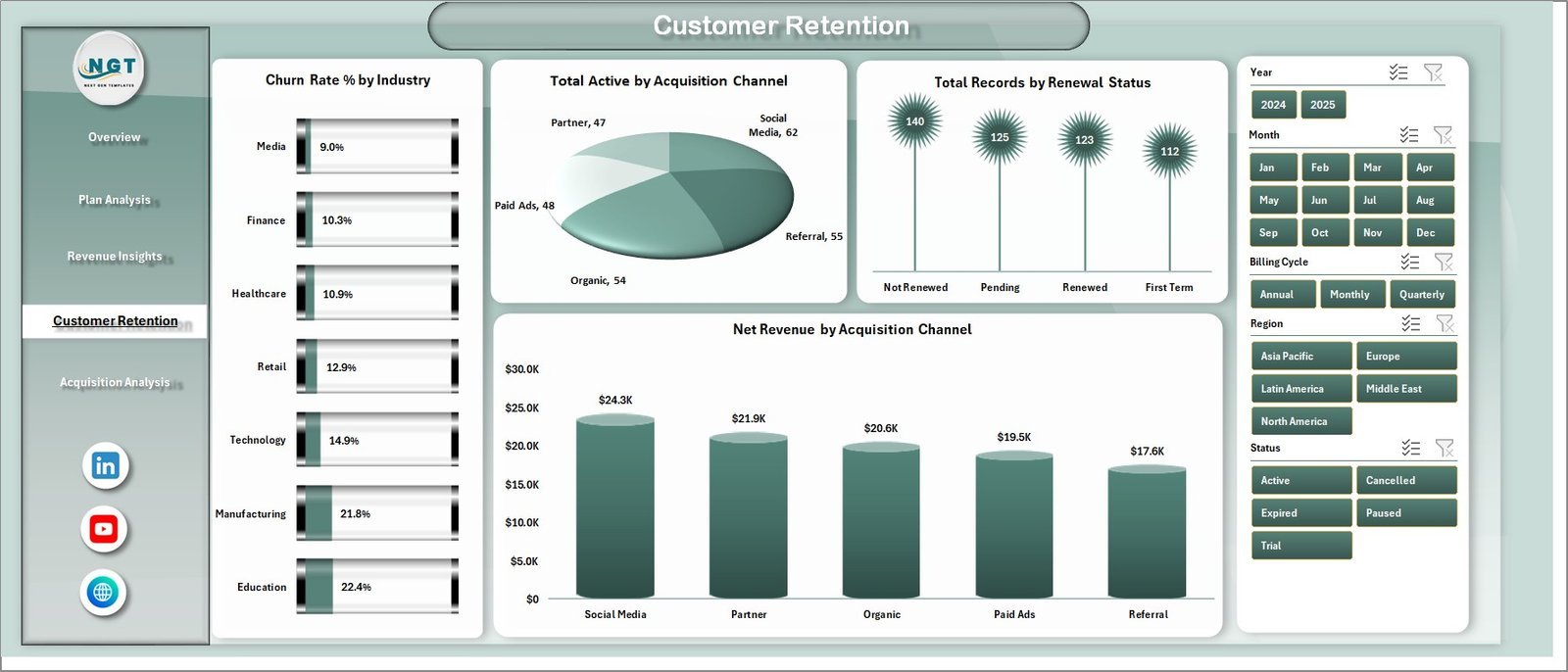 Yes. The dedicated Customer Retention page shows Churn Rate % by Industry, Total Active by Acquisition Channel, Total Records by Renewal Status, and Net Revenue by Acquisition Channel. The Overview page also displays Total Active vs Total Cancelled for quick monitoring.