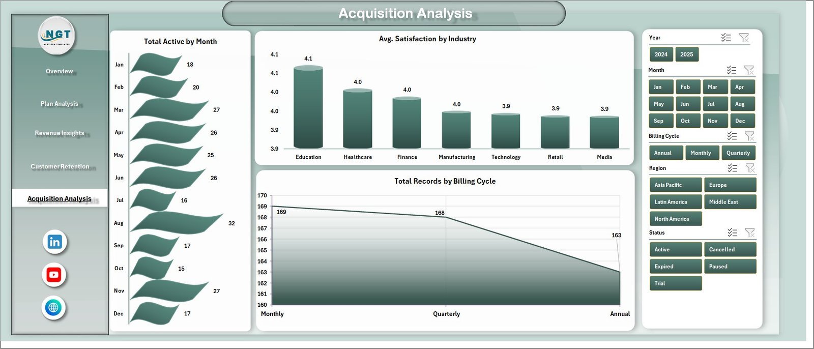 📊 Acquisition Analysis – Monitor Total Active by Month, Avg. Satisfaction by Industry, and Total Records by Billing Cycle to measure and optimize acquisition channels.