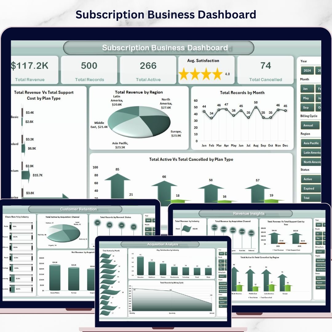 Whether you are tracking total revenue by region, analyzing churn rate by industry, measuring average satisfaction by plan type, or evaluating net revenue by acquisition channel, this Subscription Business Dashboard in Excel gives you complete visibility into your subscription operations with dynamic charts, KPI cards, and slicer-based filtering. This is one of the most comprehensive subscription analytics solutions available in Excel.