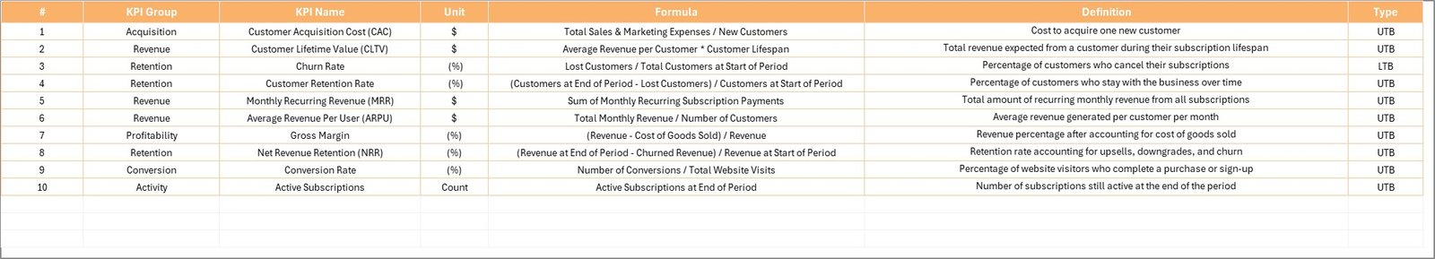 📦 What’s Inside the Subscription Business KPI Scorecard in Excel