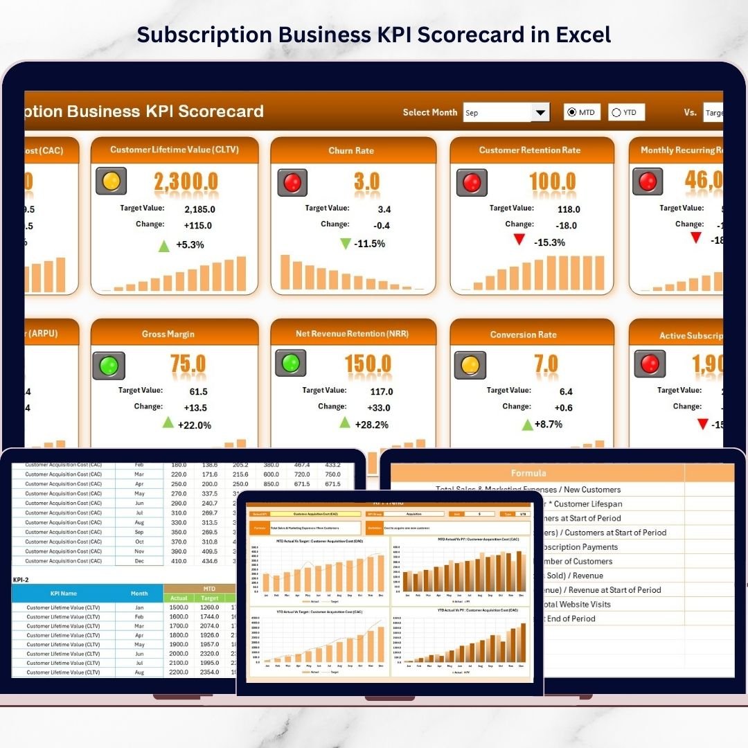 Subscription Business KPI Scorecard in Excel This powerful Excel scorecard centralizes all your key performance indicators into one interactive dashboard. Instead of analyzing multiple reports, you can instantly compare Actual vs Target performance, evaluate MTD and YTD results, and analyze KPI trends visually.