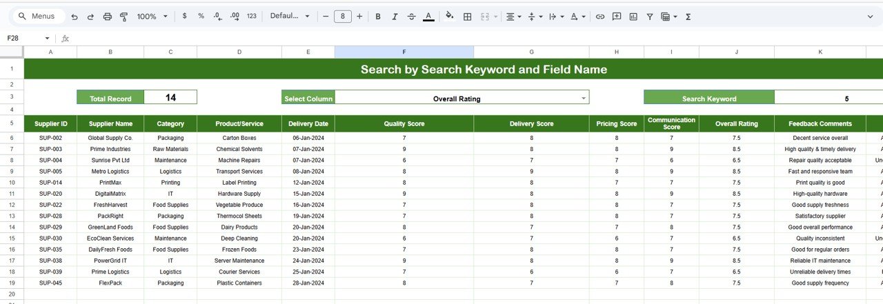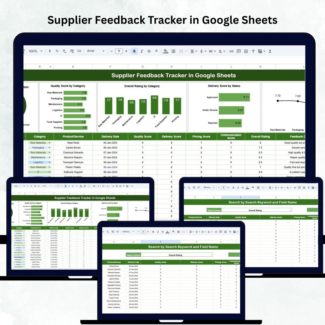 The Supplier Feedback Tracker in Google Sheets eliminates all these challenges with a structured, automated, and visually interactive solution. This ready-to-use tool captures supplier evaluations and converts them into dynamic charts, actionable insights, and a smart search system that makes performance review effortless. Whether you are evaluating raw material suppliers, service providers, equipment manufacturers, or logistics partners, this tracker brings clarity and accountability to your supplier management process.