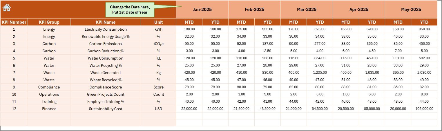 Built entirely in Microsoft Excel, this dashboard helps sustainability teams monitor MTD, YTD, and year-over-year performance, compare actuals vs targets, and visualize progress using conditional formatting and trend indicators—without complex tools or expensive software.