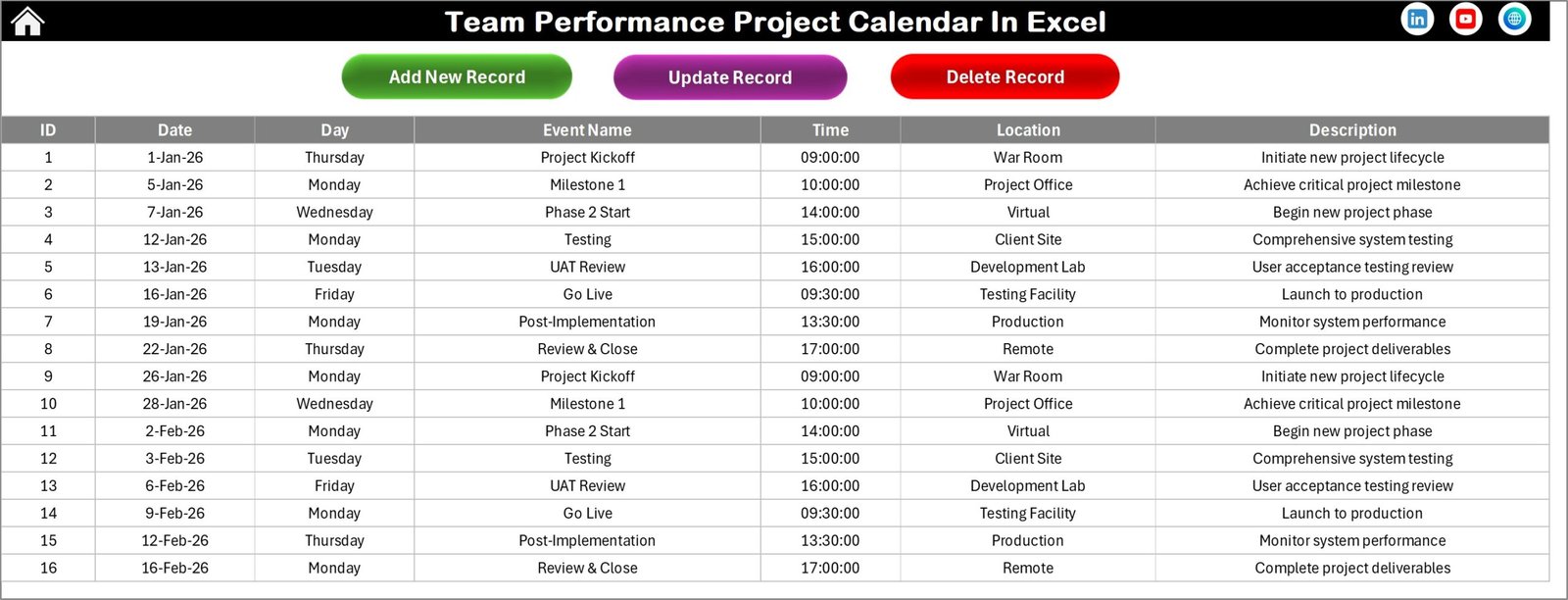 All project events, meetings, and milestones are stored in one organized workbook, allowing teams to manage schedules efficiently.
