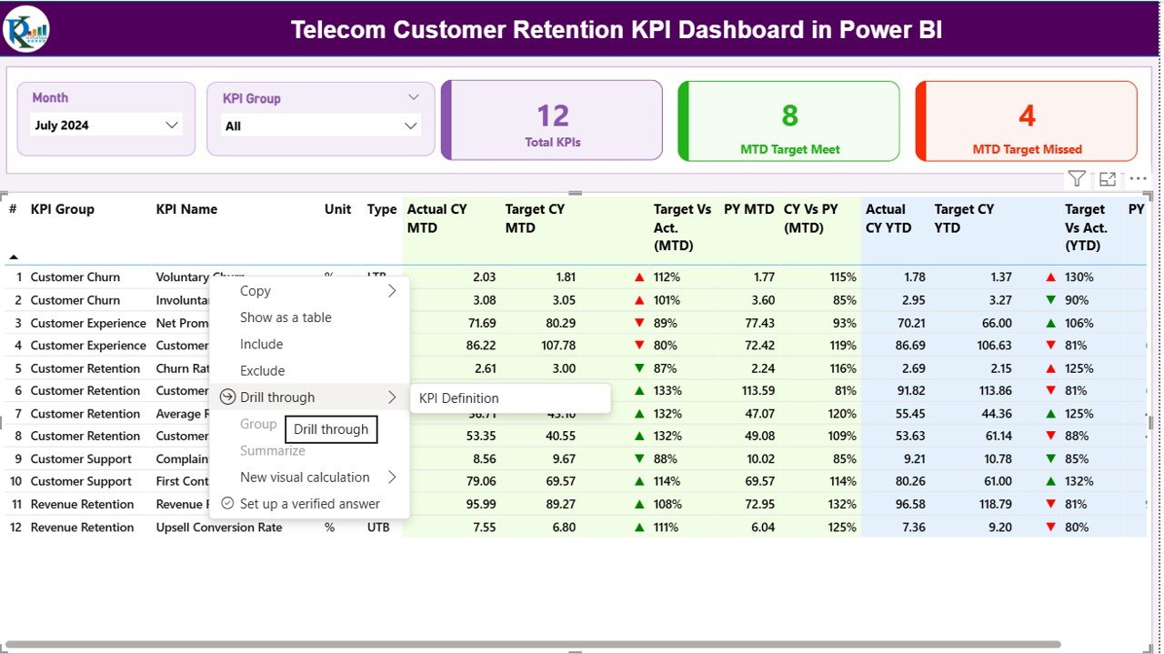 Right-click any KPI to open its detailed definition and understand the calculation logic.