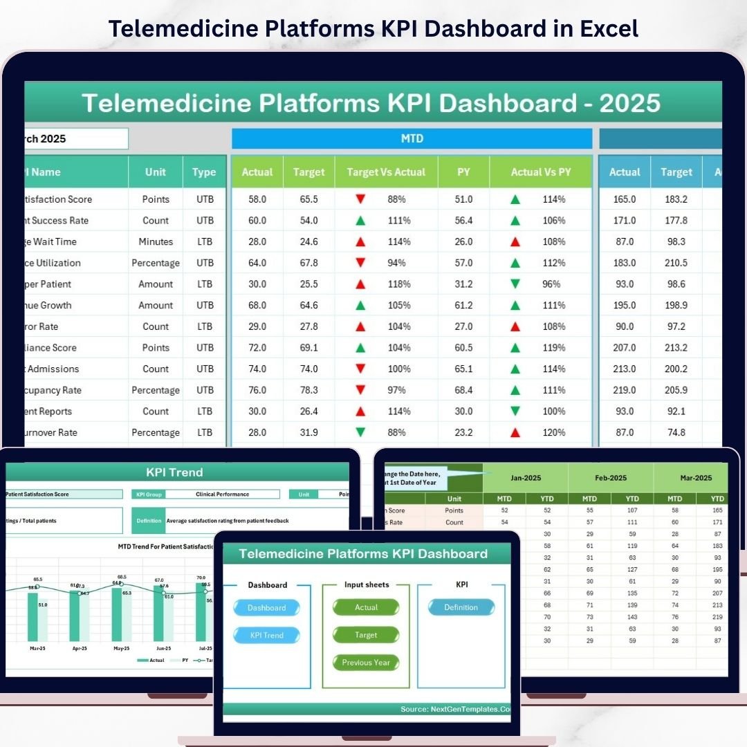 Getting started is quick and straightforward. First, enter your baseline data in the Actual Numbers Input sheet, then set your goals in the Target Number Input sheet. Add last year’s data for benchmarking in the Previous Year Number sheet. Customize your KPIs on the KPI Definition sheet to match your telemedicine platform’s unique metrics.