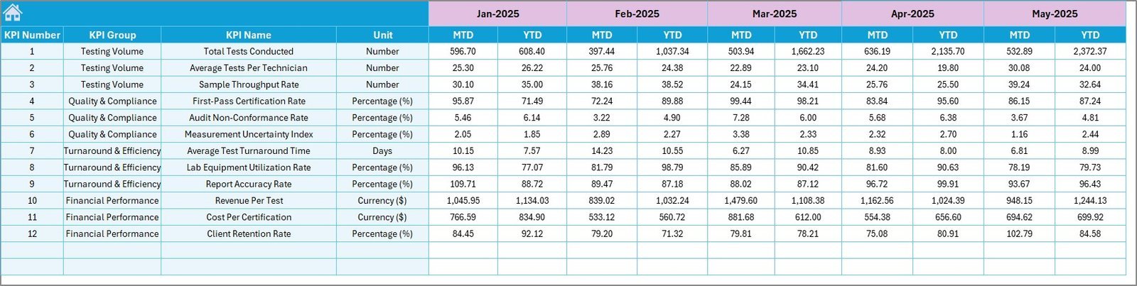Lastly, the KPI Definition Sheet allows customization and clarity by letting you define KPI names, groups, units, formulas, definitions, and type (LTB or UTB), ensuring the dashboard is tailored perfectly to your lab’s specific needs.