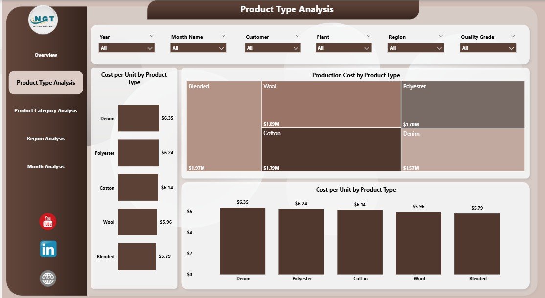 Analyzes production cost and unit cost across product types such as yarn, fabric, garments, or accessories.