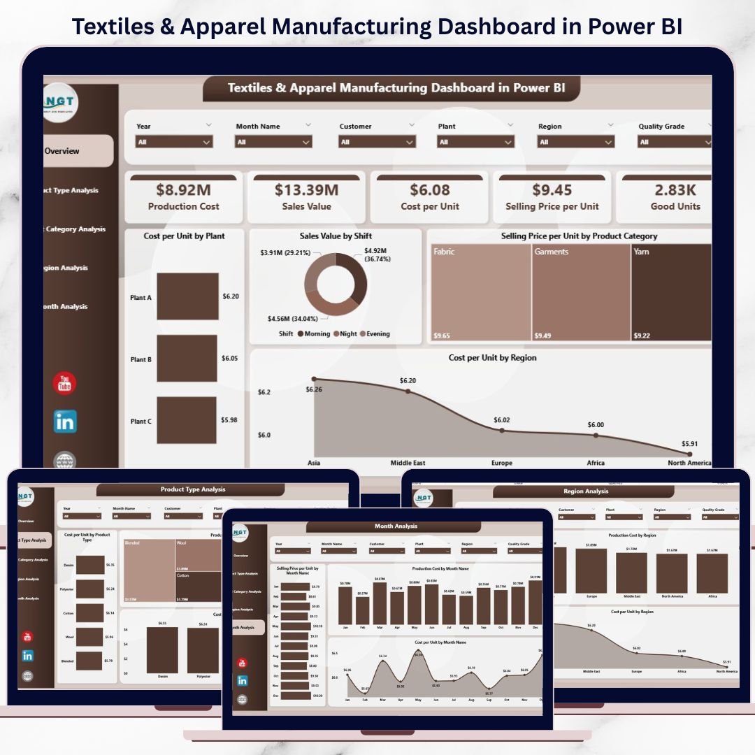 That is where the Textiles & Apparel Manufacturing Dashboard in Power BI delivers exceptional value 🚀. This ready-to-use Power BI dashboard converts raw manufacturing data into interactive visuals, KPI cards, and dynamic analysis pages. Instead of manually preparing reports, decision-makers gain instant visibility into performance and can act faster with confidence.