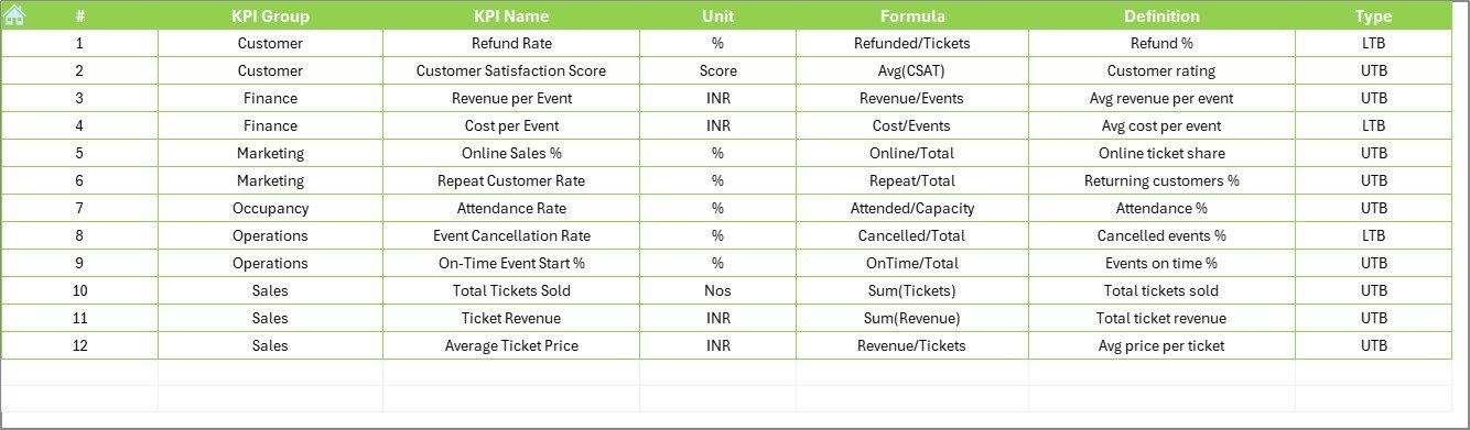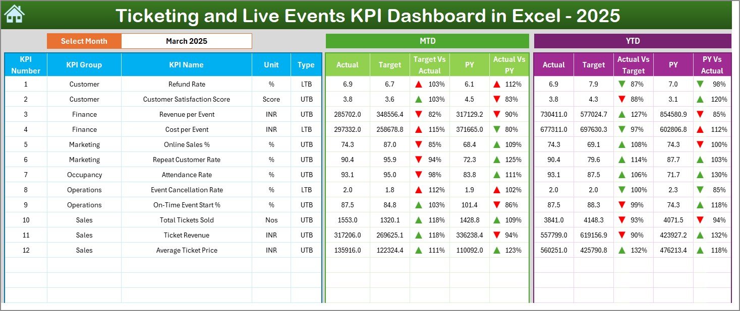 📂 What’s Inside the Ticketing and Live Events KPI Dashboard in Excel