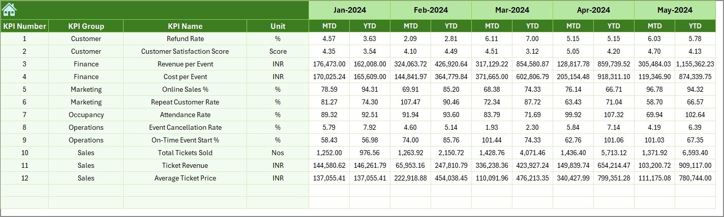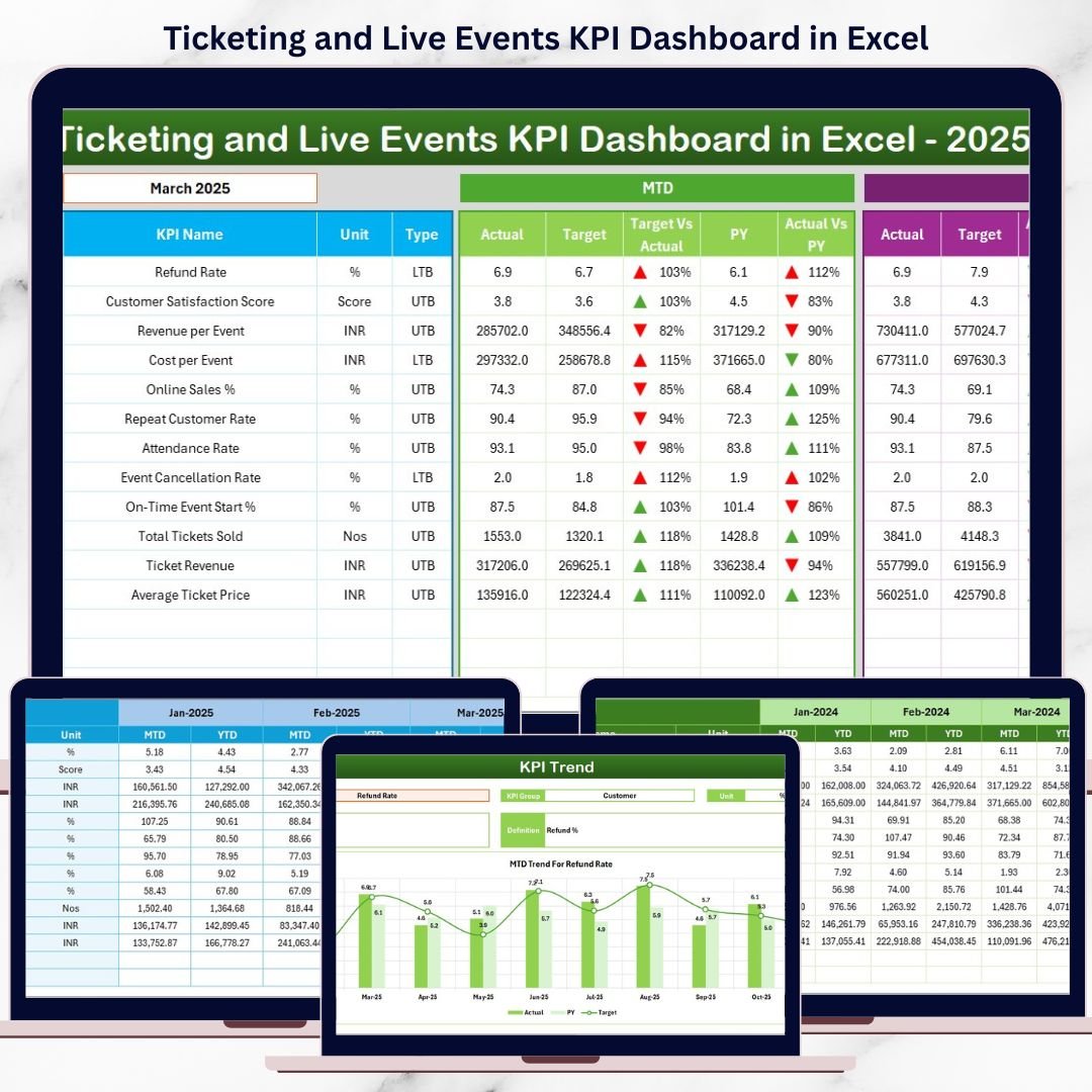 This ready-to-use Excel dashboard helps event managers, promoters, and venue teams monitor MTD, YTD, targets, and previous-year performance instantly. Instead of spending hours preparing reports, you get a fully automated KPI system that supports faster and smarter decisions for concerts, sports events, exhibitions, and festivals.