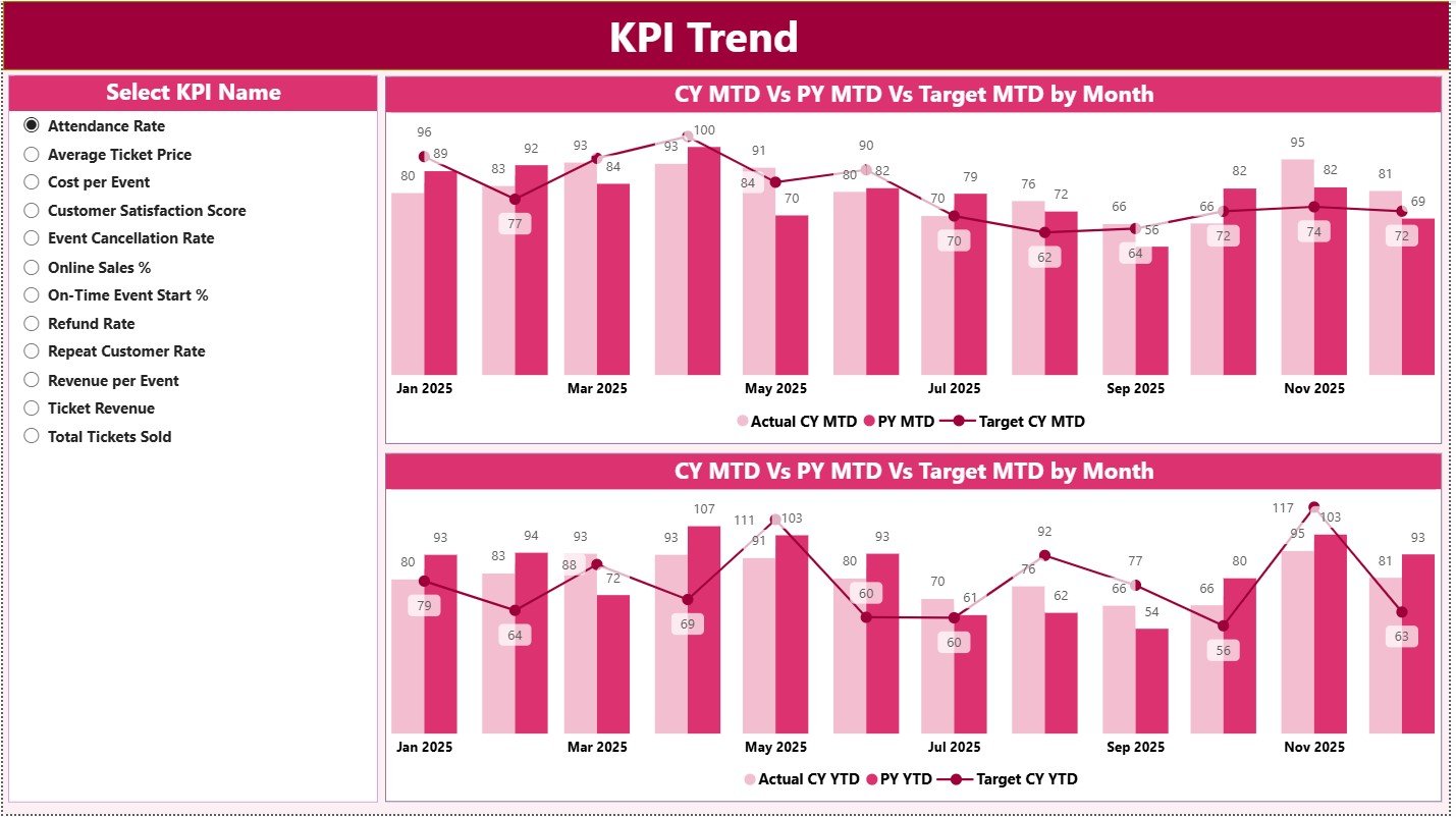 This dashboard tracks MTD, YTD, target vs actual, and previous-year performance in one centralized Power BI file—eliminating manual reporting and transforming how live event data is analyzed.