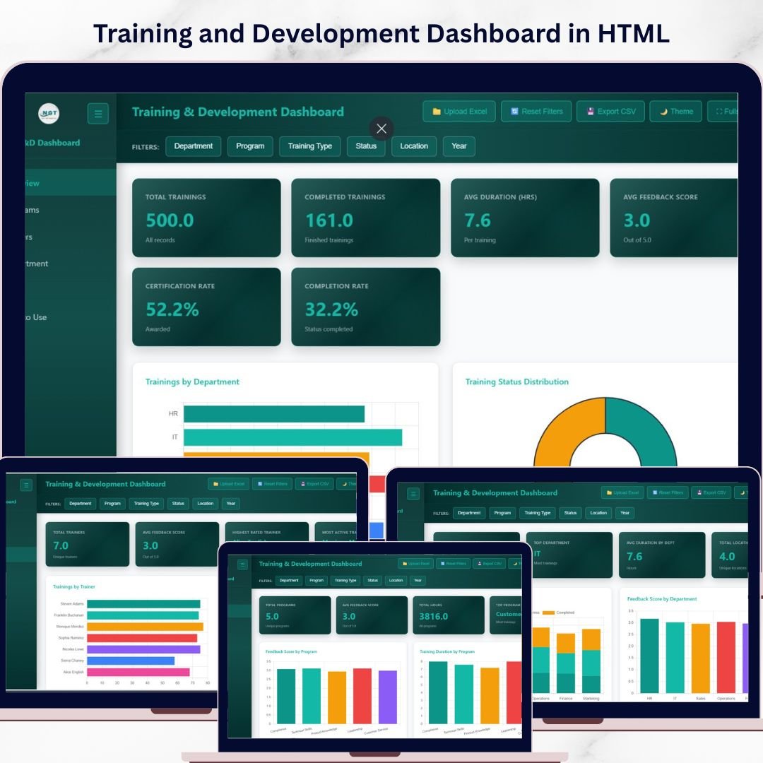 Training and Development Dashboard in HTML is a browser-based, interactive analytics template built for HR professionals, L&D managers, and training coordinators who need instant visibility into training programs, trainer performance, departmental effectiveness, and certification outcomes. This ready-to-use HTML Dashboard includes 5 dedicated pages covering an overview with KPI cards, program analysis, trainer performance, department and location analysis, and a detailed data view — giving you a complete 360-degree picture of your organization’s training landscape.Training and Development Dashboard in HTML