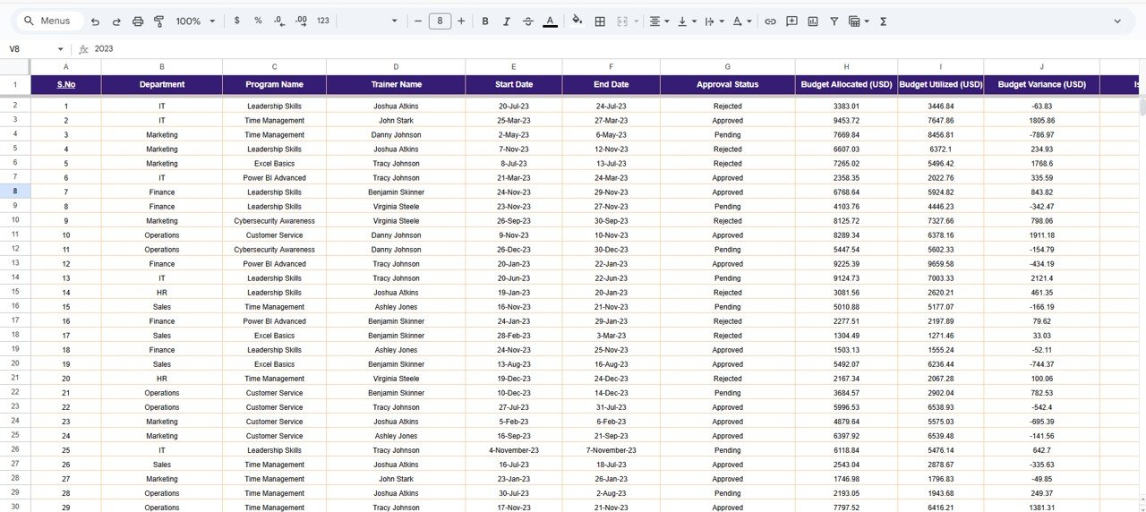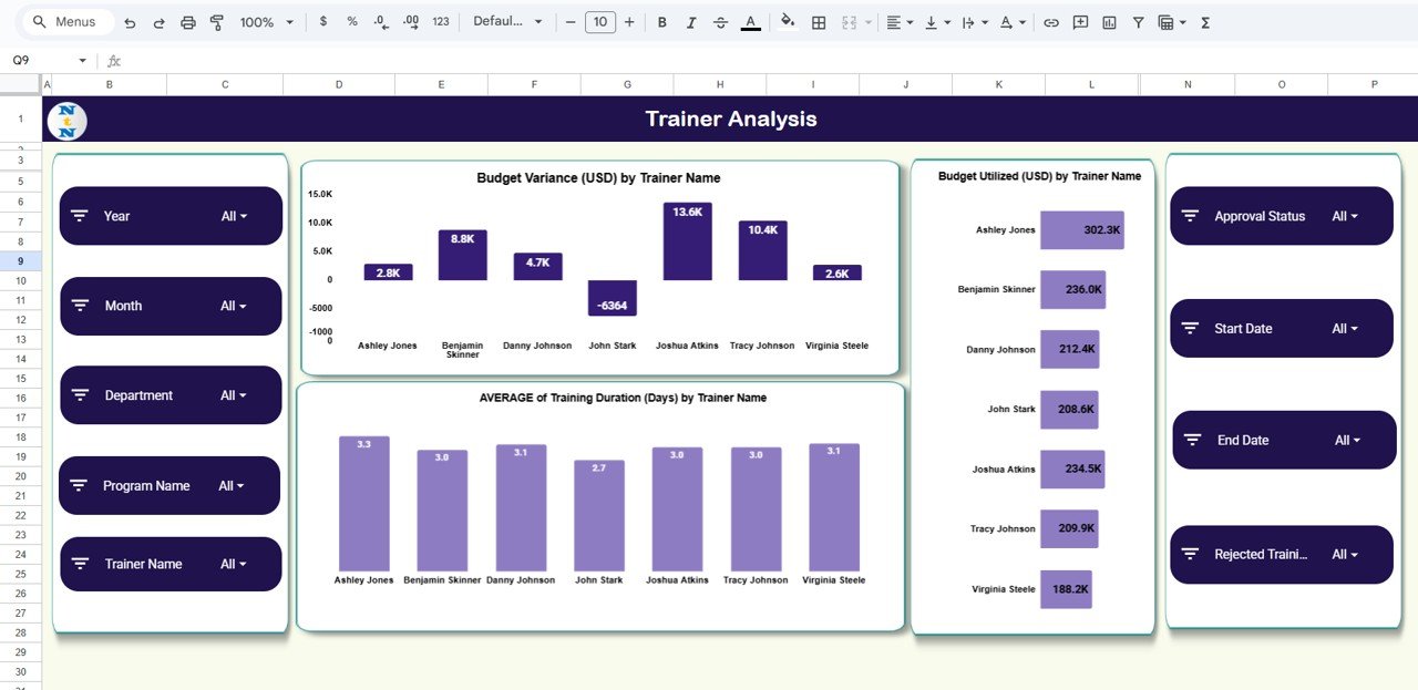 This ready-to-use dashboard centralizes all training data into a single, visual, and interactive system. HR teams, L&D professionals, finance teams, and leadership can track training volume, budget allocation, budget utilization, overspending, duration trends, and performance across departments, programs, and trainers—all from one Google Sheets file. Since everything updates automatically, teams spend less time creating reports and more time making informed decisions.