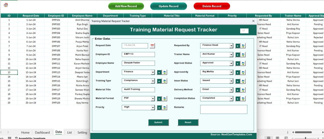 📦 What’s Inside the Training Material Request Tracker in Excel