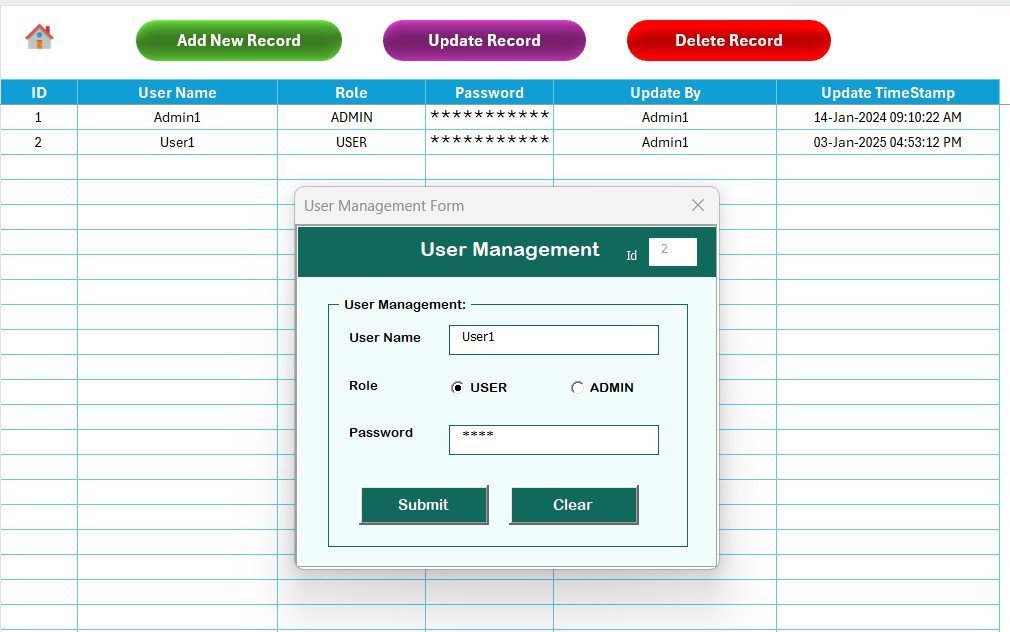 📌 Role-based User Management sheet — add or remove users, set passwords, and control which roles can access which actions.