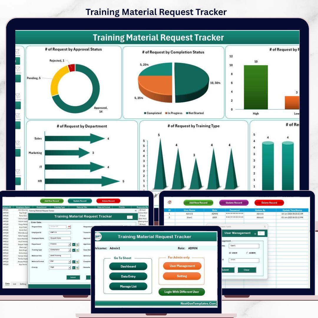 The Training Material Request Tracker in Excel is a VBA-powered workbook with 8 worksheets that lets HR, L&D, and training teams log, approve, and report on every training material request — manuals, e-learning licences, printed guides — inside one secured Excel file with login and role-based access.