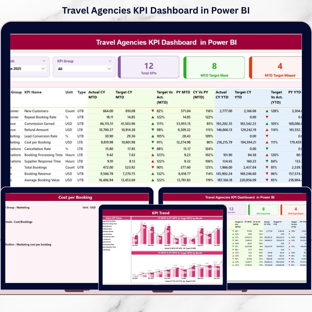 Travel Agencies KPI Dashboard in Power BI This ready-to-use Power BI dashboard is designed specifically for travel agencies that want real-time visibility, clear KPI tracking, and data-driven decision-making. Instead of reviewing multiple reports, managers get one centralized dashboard that displays MTD (Month-to-Date) and YTD (Year-to-Date) performance, target achievement, and year-over-year comparisons with clear visual indicators. As a result, leadership teams gain clarity, speed, and confidence in managing business performance.