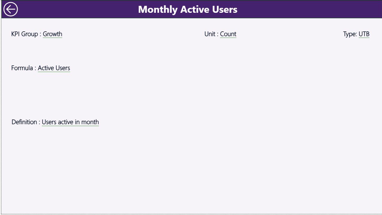 Click any KPI to view its formula, unit, definition, and performance type (LTB or UTB).