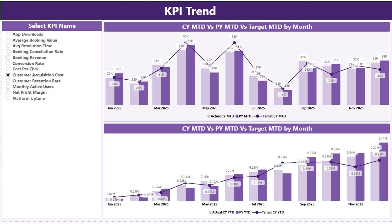 This ready-to-use Power BI dashboard helps travel technology companies track, analyze, and compare their most important KPIs using clear visuals, smart indicators, and Excel-based data inputs. Instead of guessing performance, founders and leadership teams gain instant clarity across MTD, YTD, target vs actual, and year-over-year trends—all in one place.