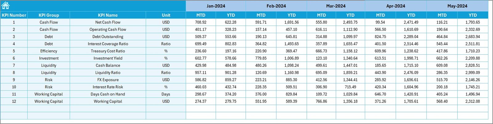 Dashboard Sheet – Displays all treasury KPIs in one view with MTD & YTD performance