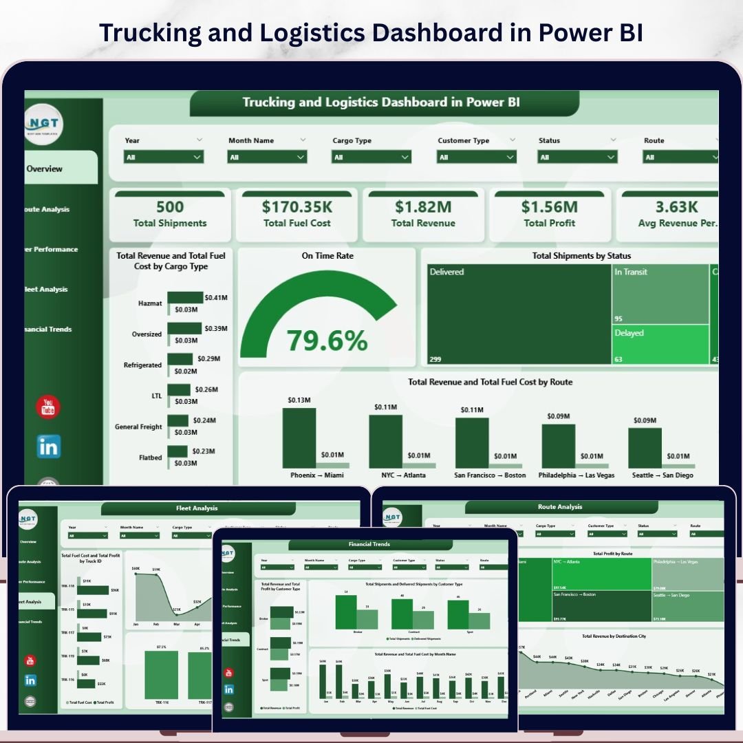Trucking and Logistics Dashboard in Power BI is a professionally designed, ready-to-use analytics template built for fleet managers, trucking companies, logistics coordinators, and supply chain professionals who need full visibility into revenue, fuel costs, route efficiency, driver performance, and fleet operations — all from one powerful Power BI dashboard. This template features 5 interactive dashboard pages that transform your raw trucking and logistics data into clear, actionable visual insights.