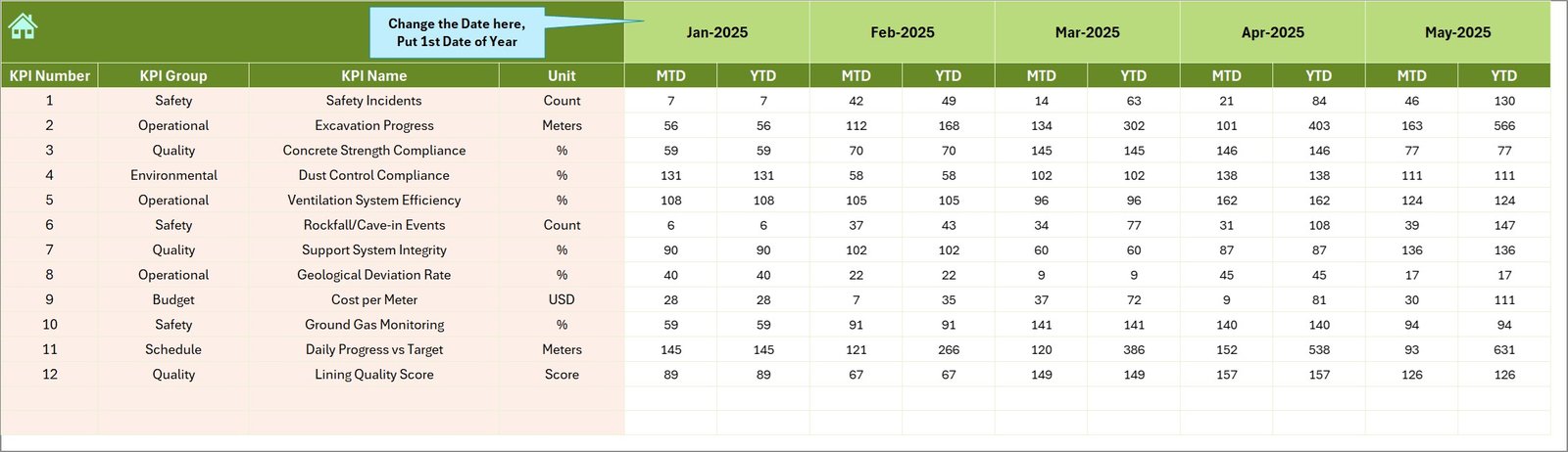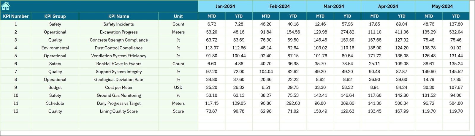 Monitor all important tunnel engineering KPIs in a centralized Excel dashboard that updates automatically based on the selected month.