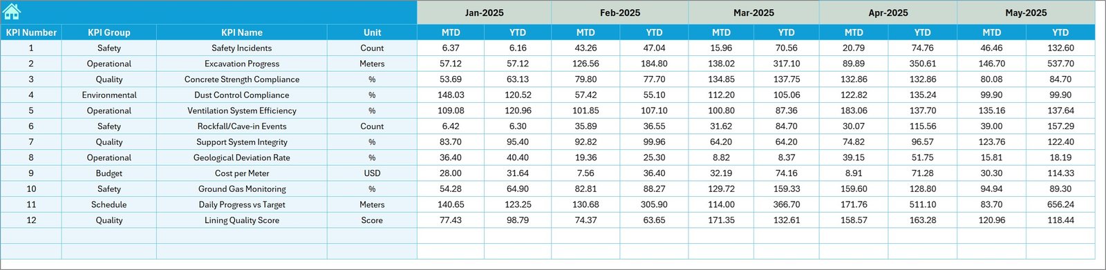 The Tunnel Engineering KPI Dashboard in Excel provides a powerful and structured solution for monitoring tunnel construction performance. This ready-to-use Excel template helps project teams track KPIs, compare targets with actual results, analyze trends, and evaluate project efficiency from a single interactive dashboard.